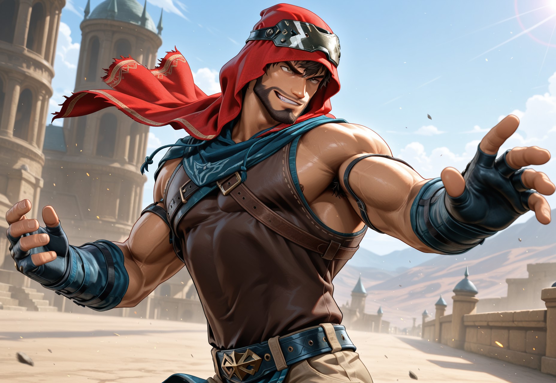 Shaheen, beard, brown eyes, brown skin, hood, fingerless gloves, chain, armor