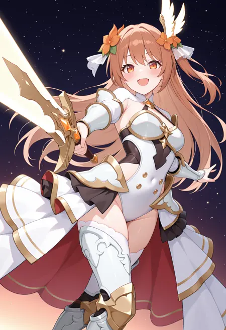 - pnozolib, 한쪽으로 올린 머리, 헤어 플라워, 베일, 날개 모양 헤어 장식, 헤어 장식, 흰 레오타드, 갑옷 레오타드, 이색 레오타드, 흰 쇼그, 금장식, 엉덩이 통풍구, 분리형 소매, 엉덩이 갑옷, 흰 드레스, 쇼걸 스커트, 층층이 된 스커트, 양면 직물,