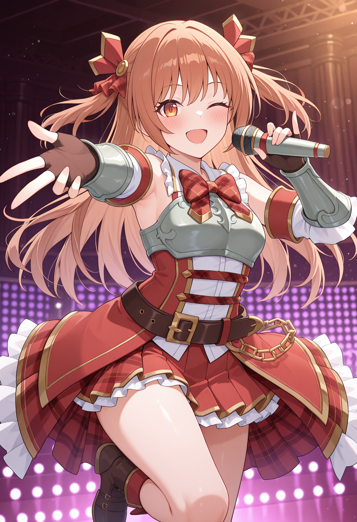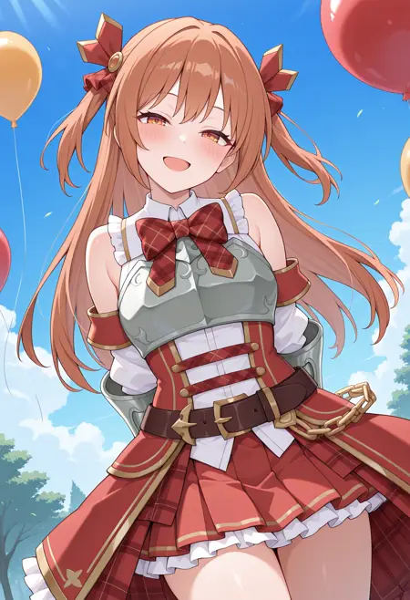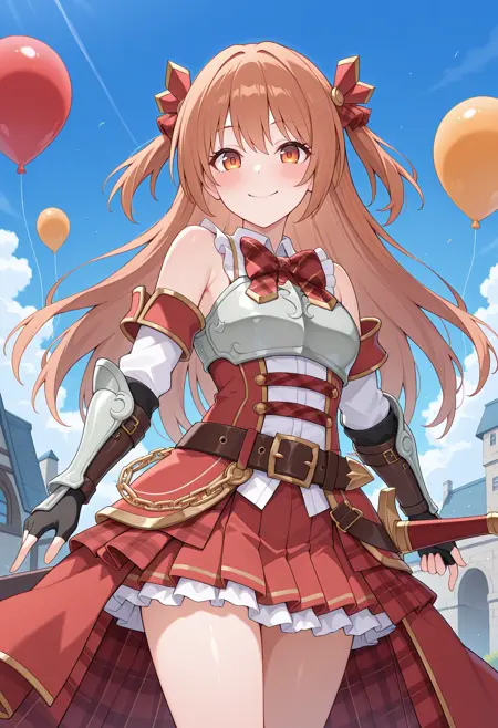 pnozodef, 양쪽으로 올린 머리, 헤어 리본, 체크 무늬 리본넥타이, 빨간 리본넥타이, 어깨 노출, 가슴판, 프릴, 흰 셔츠, 빨간 드레스, 벨트, 손가락 없는 장갑, 분리형 소매, 판금, 벨트, 체인, 빨간 스커트, 주름 스커트, 프릴 스커트, 겉스커트, 체크 무늬 스커트, 허벅지,