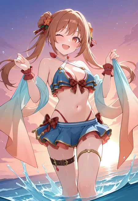 - pnozosum, 머리 땋기, 쌍꼬리, 헤어 장식, 헤어 리본, 파란 비키니, 다색 비키니, 층층이 된 비키니, 십자형 홀터, 체크 무늬 리본, 손목 밴드, 그라디언트 숄, 투명 숄, 비키니 스커트, 파란 스커트, 하이레그 비키니, 빨간 비키니, 허벅지 스트랩, 십자형 허벅지 스트랩,