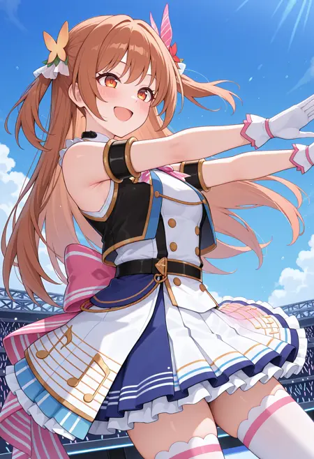 - pnozidol, 양쪽으로 올린 머리, 아이돌, 아이돌 복장, 헤어 플라워, 나비 모양 헤어 장식, 헤어 리본, 줄무늬 리본, 줄무늬 리본넥타이, 리본, 분홍색 리본넥타이, 어깨 노출, 조끼, 이색 조끼, 이색 셔츠, 흰 셔츠, 검은 셔츠, 밴드 유니폼, 음표 프린트, 팔찌, 흰 장갑, 검은 벨트, 흰 스커트, 다색 스커트, 하프 스커트, 그라디언트 스커트, 파란 스커트, 흰 스커트, 프릴 스커트, 층층이 된 스커트, 뒤 리본, 흰 허벅지 양말,