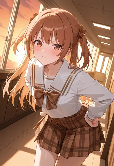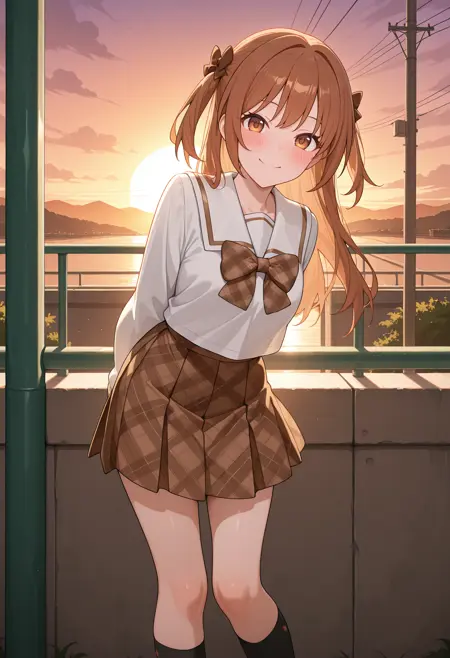 serafuku, 체크 무늬 리본넥타이, 갈색 리본, 흰 셔츠, 긴 소매, 체크 무늬 스커트, 갈색 스커트, 검은 양말, 무릎 높이 양말, 신발,