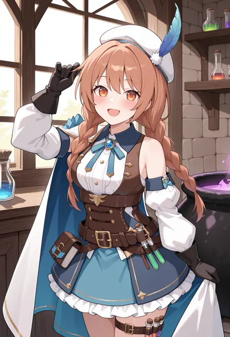 - pnozoate, 두 줄 땋기, 흰 헤드웨어, 베레모, 모자 깃털, 갈색 조끼, 흰 셔츠, 칼라 셔츠, 파란 칼라, 소매 없음, 어깨 노출, 흰 소매, 분리형 소매, 풍선 소매, 검은 장갑, 십자 벨트, 흉부 아래, 층층이 된 스커트, 파란 스커트, 프릴 스커트, 허벅지 스트랩, 병, 양면 망토, 흰 망토, 파란 망토,