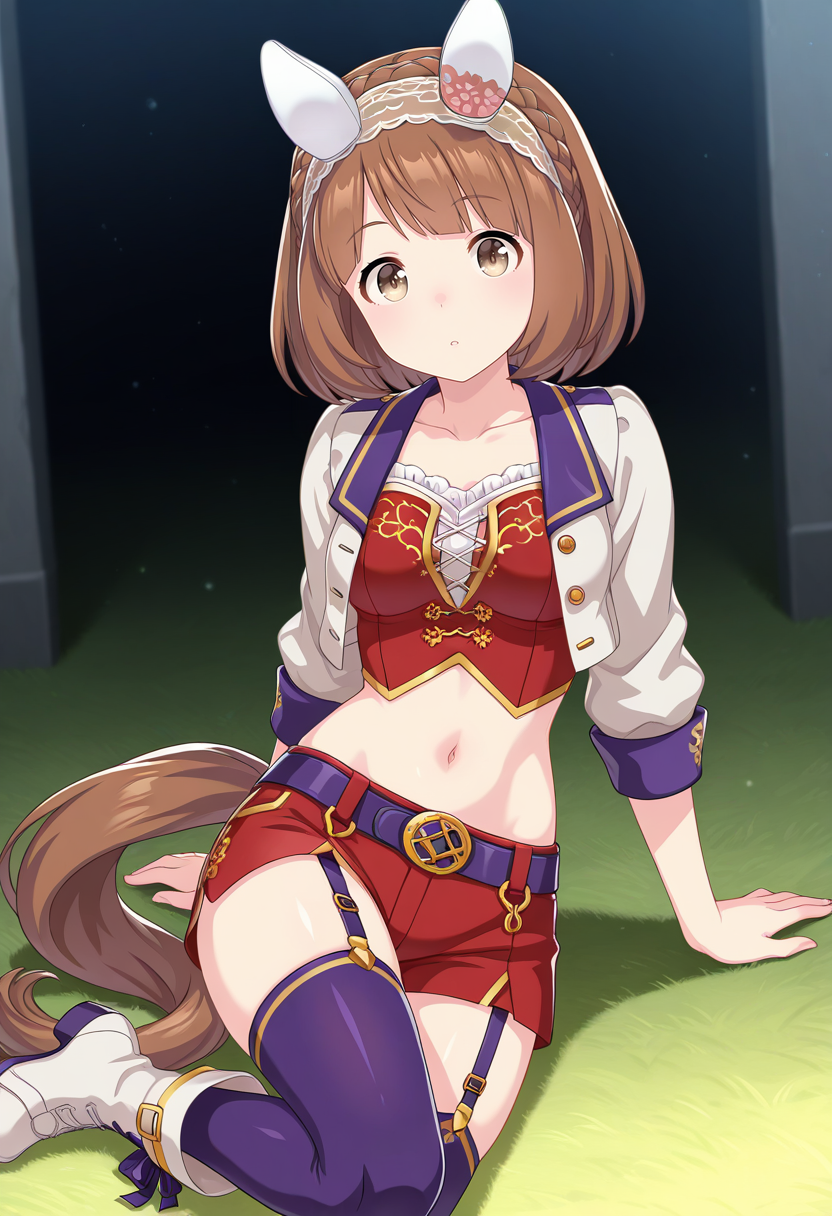yukino_bijin_nekoforge, 1girl, brown eyes, brown hair, short hair, crown braid, horse ears, horse tail, headband, hairband, ear covers, small breasts, medium breasts