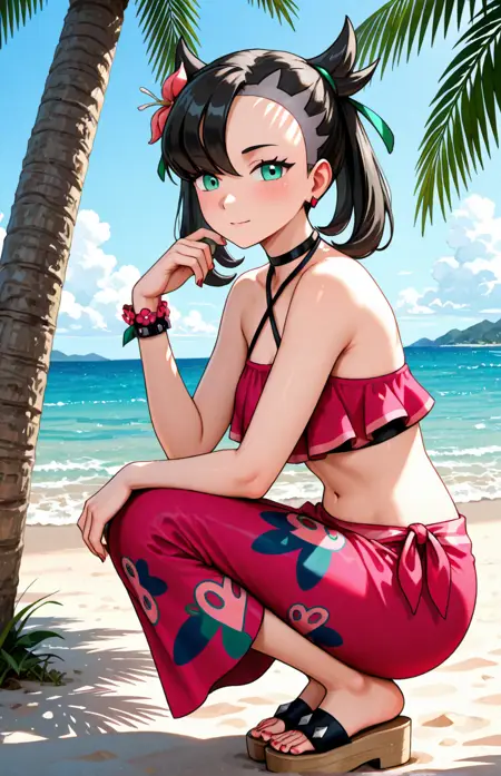 머리 꽃, 분홍 꽃, 히비스커스, 프릴이 있는 비키니, 크리스크로스, 헬터, 검은 목걸이, 배꼽, 팔찌, 손목 꽃, 프린트 사롱, 빨간 사롱, 빨간 네일, 플랫폼 샌들