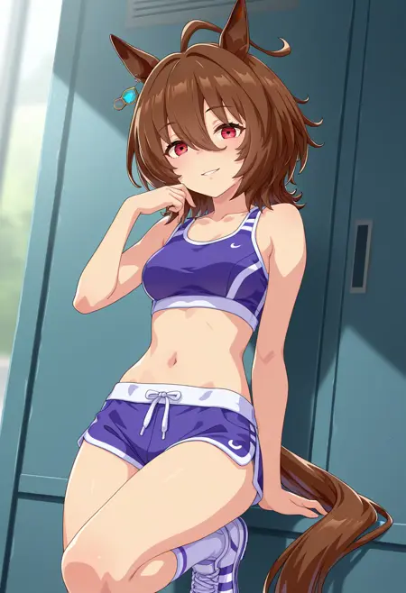 agnes_tachyon_nekoforge, 1girl, red eyes, brown hair, short hair, hair between eyes, ahoge, horse ears, horse tail, single earring, earrings, jewelry, small breasts, medium breasts, agnes tachyon (umamusume)