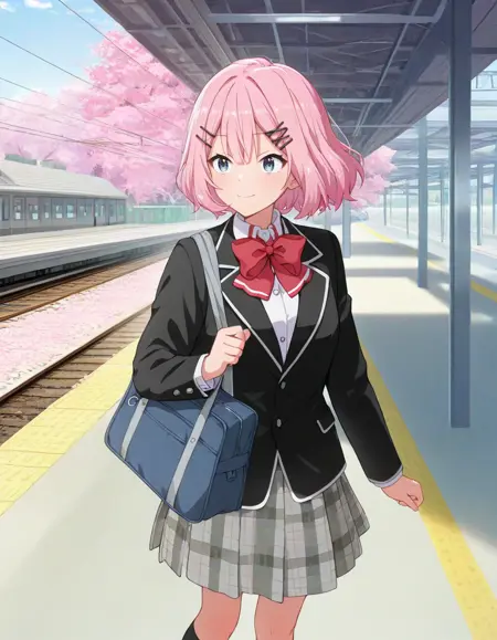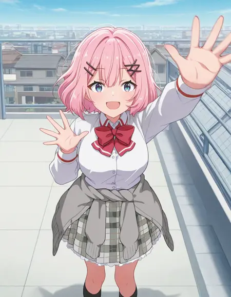 <lora:renako_amaori-watanare_s1-ixl-anime-soralz:1>, 레나코 아마오리(와타나레), 단발, 분홍색 머리, 헤어클립, 보라색 눈