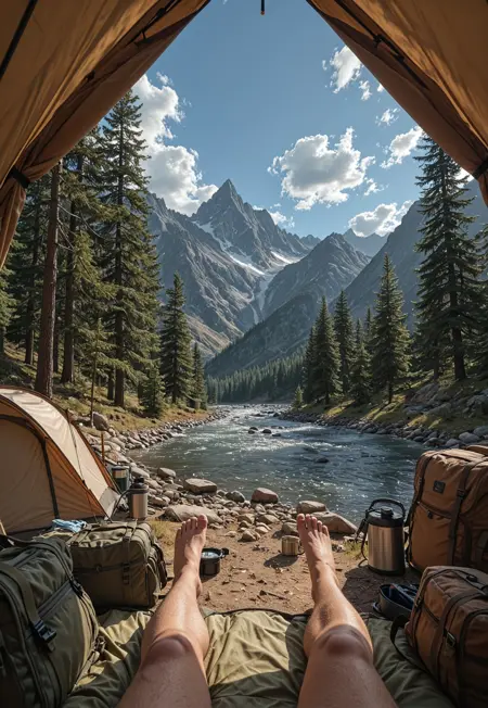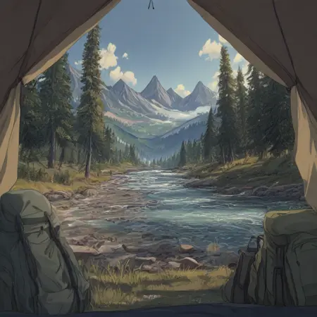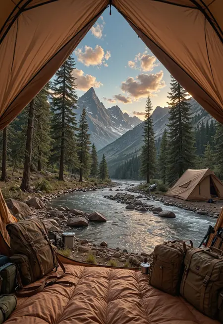 Moucammb2, 하늘, 산, 나무, 야외, 낮, 구름, 자연, 가방, 텐트, 물, 강, 풍경