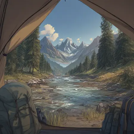 Moucammb2, sky, mountain, tree, outdoors, day, cloud, nature, bag, tent, water, river, scenery,