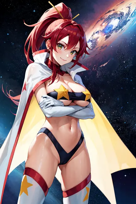 outfit2yl1, ponytail, underboob, cape, bandeau, hair ornament, strapless, tube top, midriff, white gloves, star (symbol), thighhighs