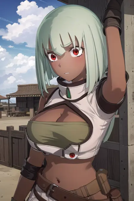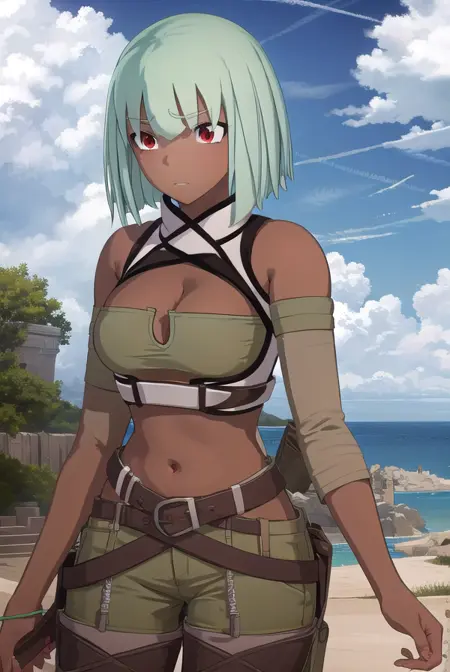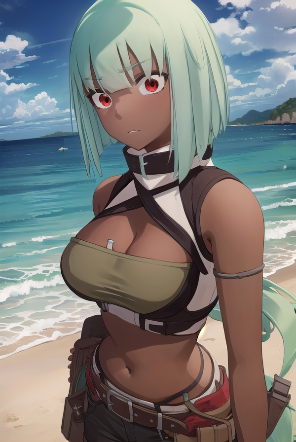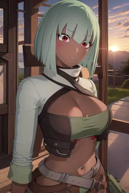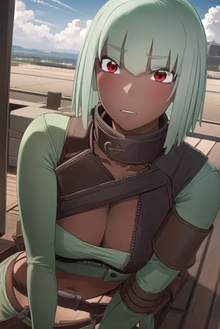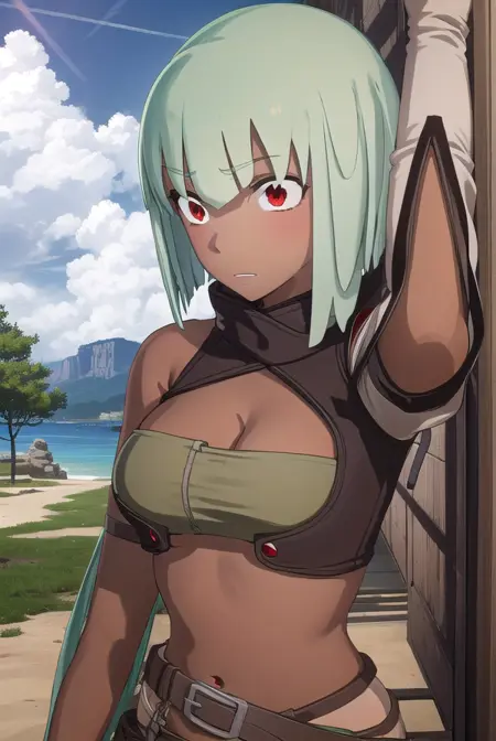 에메랄드 슈스트라이, 짧은 헤어, (빨간 눈:1.5), 녹색 머리카락, 검은 피부, 검은 피부를 가진 여자,