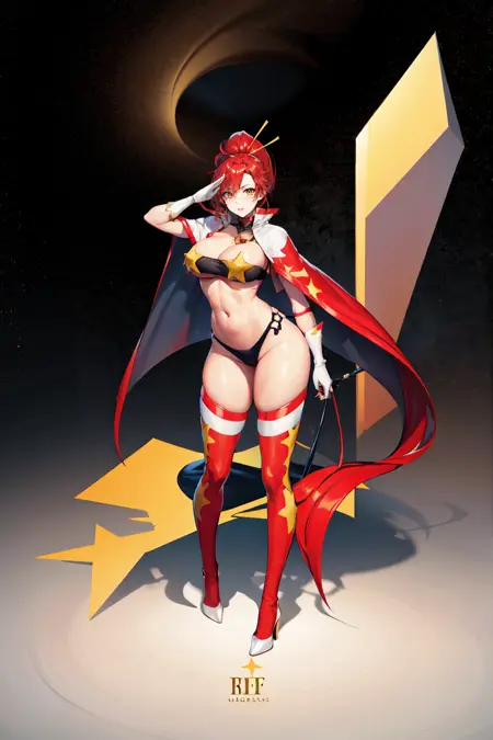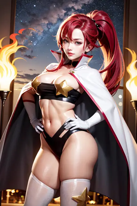 outfit2yl1, ponytail, underboob, cape, bandeau, hair ornament, strapless, tube top, midriff, white gloves, star (symbol), thighhighs