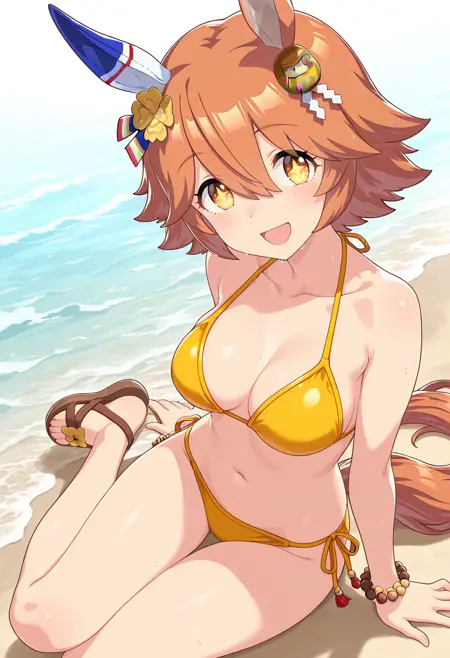 matikanefukukitaru_nekoforge, 1girl, yellow eyes, orange hair, short hair, flipped hair, hair between eyes, horse ears, horse tail, orange tail, single ear cover, ear covers, four-leaf clover hair ornament, clover hair ornament, medium breasts, matikanefukukitaru (umamusume)