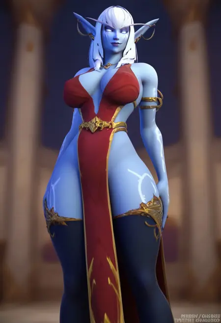 Amelette,white hair,blue skin,silver eyes,glowing eyes,Long eyebrows,pointy ears,no esclera,bangs,sidelocks,Long hair,tattoo,armlet,jewelry,earings,red dress,pelvic curtain,, tighhighs,high heels,Golden sandals