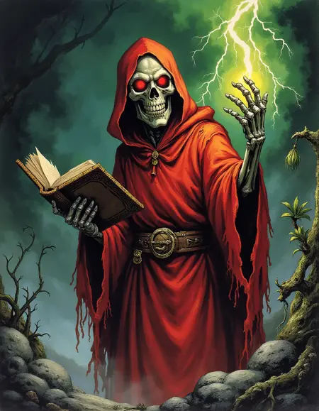 Example Prompt: A hooded necromancer raises a skeletal army from crumbling graves inside an ancient moonlit cemetery. Drawn in the 1980s RPG style, vintage fantasy dndllstr style illustration hand-inked with dramatic shadows and fantasy details.