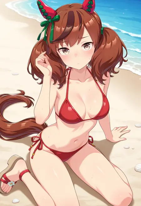 nice_nature_nekoforge, 1girl, brown eyes, brown hair, red hair, multicolored hair, streaked hair, medium hair, twintails, horse ears, horse tail, ear covers, nice nature (umamusume)