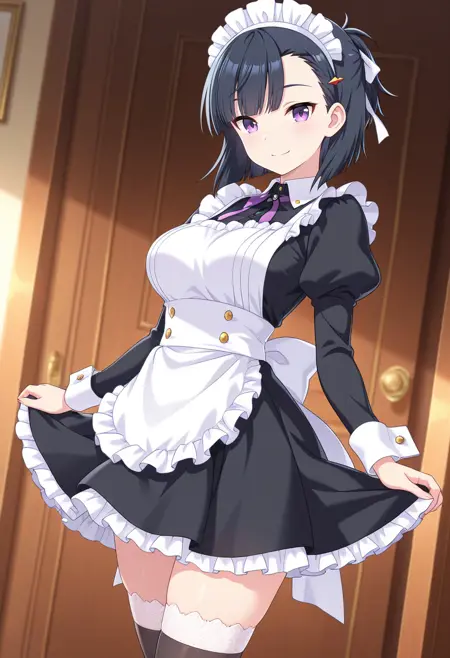 kiryuin_aoi_nekoforge, 1girl, purple eyes, black hair, short hair, asymmetrical bangs, hair ornament, hairclip, kiryuin aoi (umamusume)