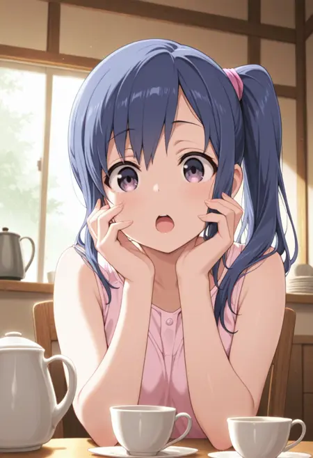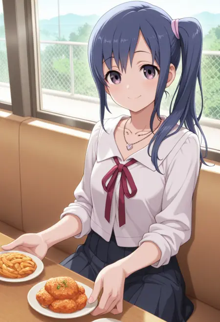 Trigger Words: imai midori, blue hair, side ponytail, long hair, purple eyes