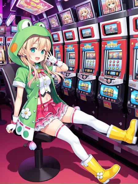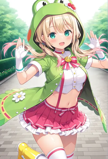 | トレーニングワード | nijikawa_laki, blonde hair, aqua eyes, long hair, twintails,コピーしました! animal hood, green hooded jacket, ribbon trim, thighhighs, gloves, skirt, short sleeves, navel, white gloves, jacket, fingerless gloves, pink skirt, midriff, suspenders, layered skirt, flower,white thighhighs,miniskirt, zettai ryouiki, suspender skirt, pleated skirt, frills, yellow footwear, rubber boots,コピーしました! |