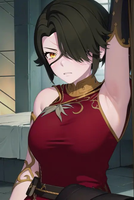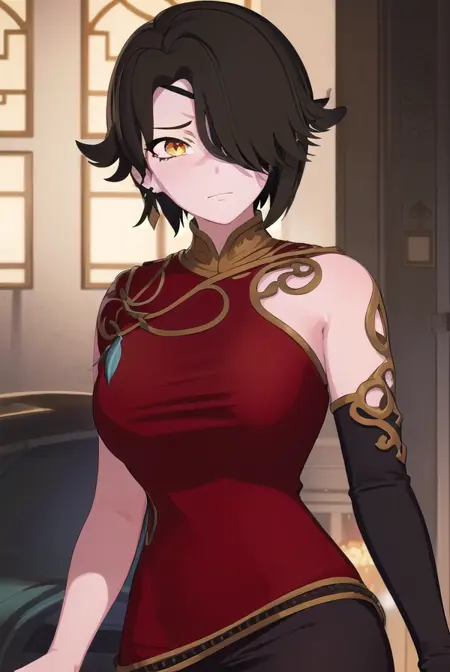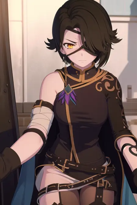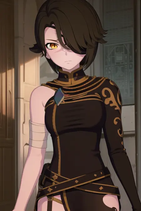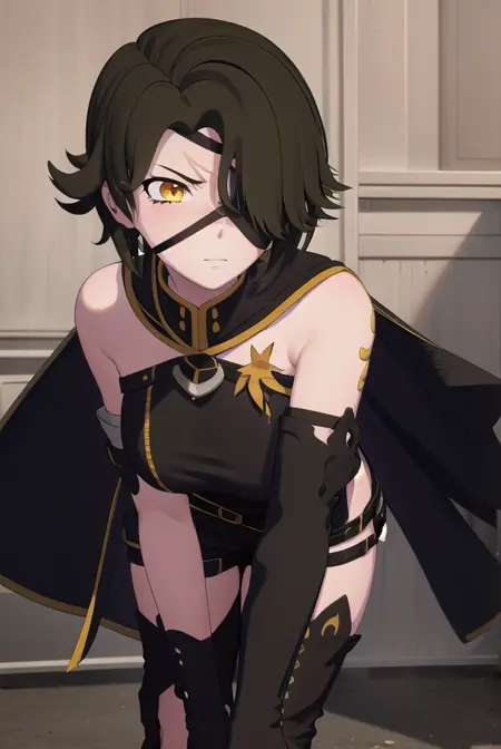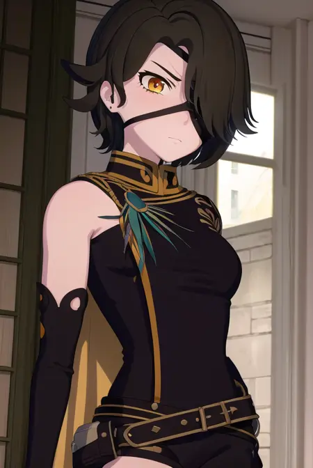 cinder fall, short hair, black hair, (yellow eyes:1.5),