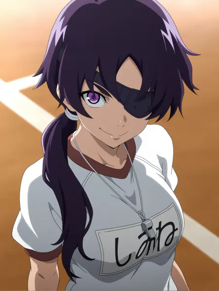 IL_由乃·明乃运动服,单人,1女孩,紫色头发,长发,低马尾,紫色眼睛,胸部,中等胸部,眼罩