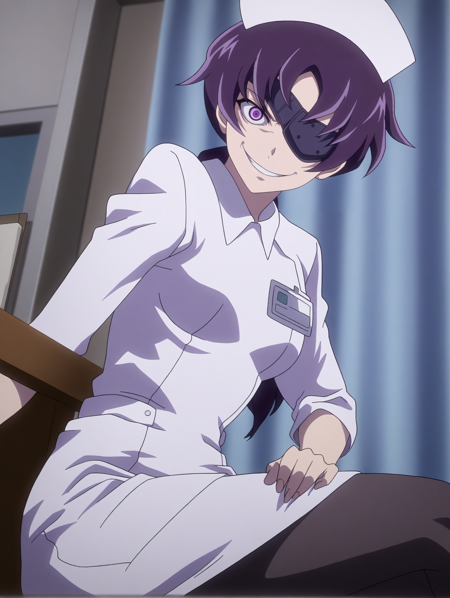 IL_由利井ミネネ ナース、一人、女の子、紫髪、ショートヘア、ローポニーテール、紫目、胸、アイパッチ