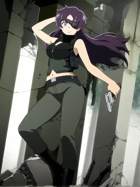 IL_由利井ミネネ_軍服、ロングヘア、紫髪、紫目、へそ、ホルスター、ベスト、グリーンベスト、パンツ、グリーンパンツ、ブーツ、ノースリーブ、ジッパー、軍、軍服