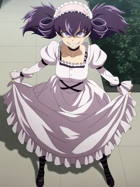 IL_由利井ミネネ_メイド、ドレス、紫目、ツインテール、パンスト、フリル、ふわふわ袖、紫髪、ドリルヘア、ストライプ、ヘアバンド、チョーカー、フリル