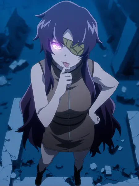 IL_由利井ミネネ、一人、女の子、紫髪、ロングヘア、紫目、胸、大きい胸、アイパッチ