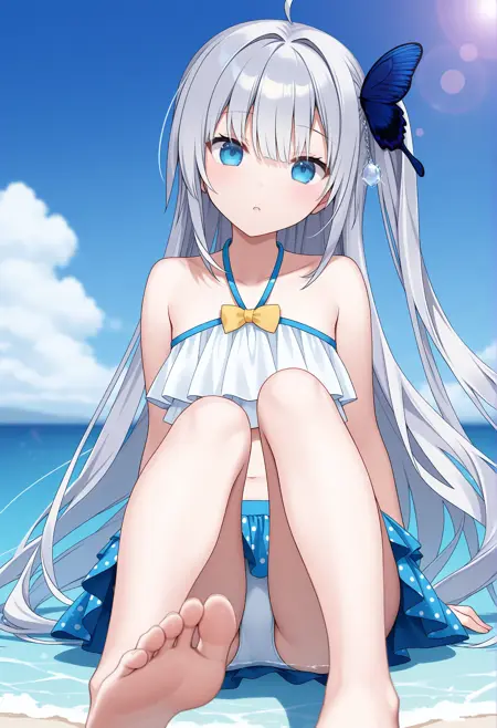 diamond hair ornament,frilled bikini,layered bikini,white bikini,yellow bow,bikini skirt,halterneck,blue skirt,polka dot skirt,miniskirt,