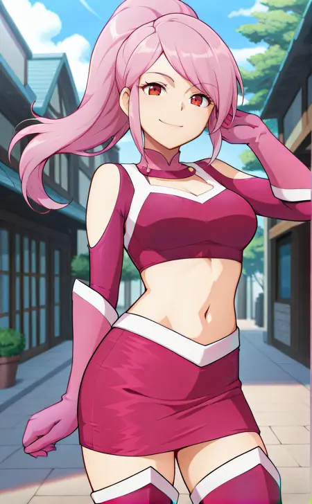 lavana, pink hair, red eyes, ponytail, pink top, pink skirt, midriff, pink gloves, pink thighboots