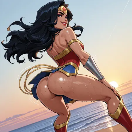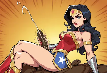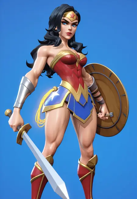 | トレーニングワード | 1girl, solo, DC Comics, Wonder Woman, black hair, long hair, gold tiara, blue eyes, red lipstick, red corset, gold belt, gold trim, blue skirt, gladiator skirt, star (Symbol), gold armlet, silver bracers, bare thighs, red and gold knee boots, コピーしました! Holding sword, holding shield, rope on hip, glowing rope, yellow rope,コピーしました! |