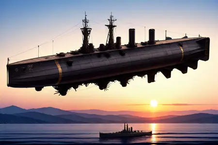 airship, [u-boat submarine, | battleship ] {world war ii | steampunk, victorian, }