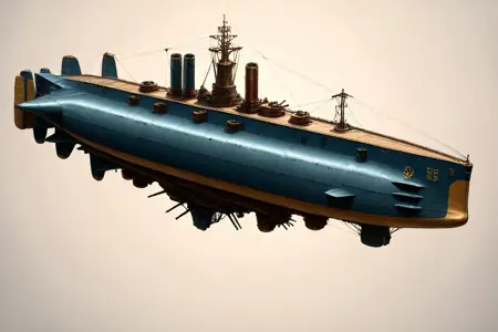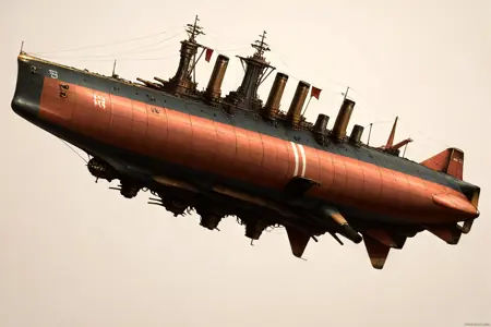 飞行战舰——也称为空中飞艇或天空无畏舰——是经常出现在蒸汽朋克和科幻题材中的巨型空中战舰。这些幻想载具融合了复古未来主义设计与先进或想象中的技术,通常受到19世纪机械的启发,如软式飞艇、装甲战舰和齿轮驱动引擎。