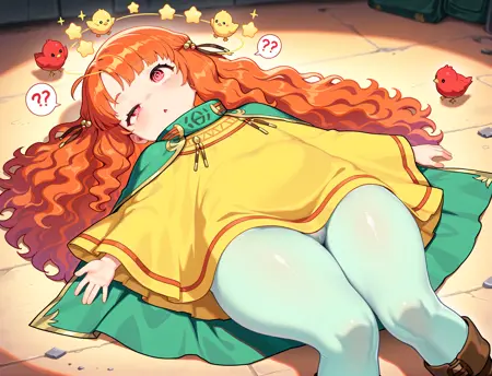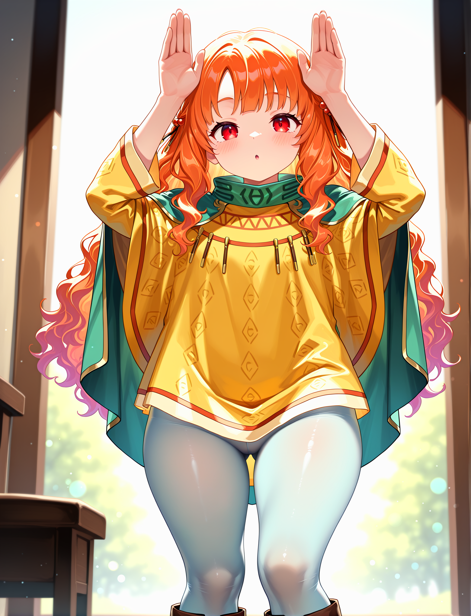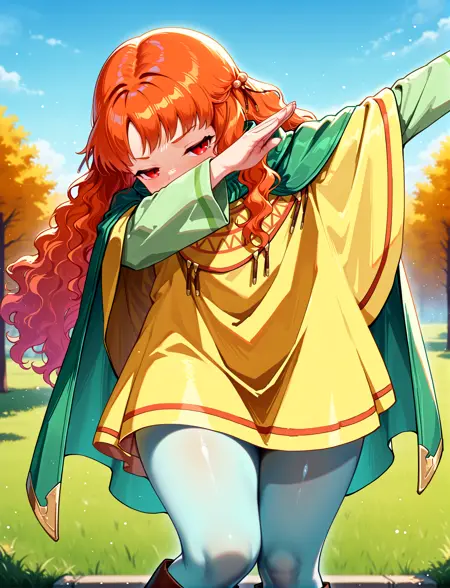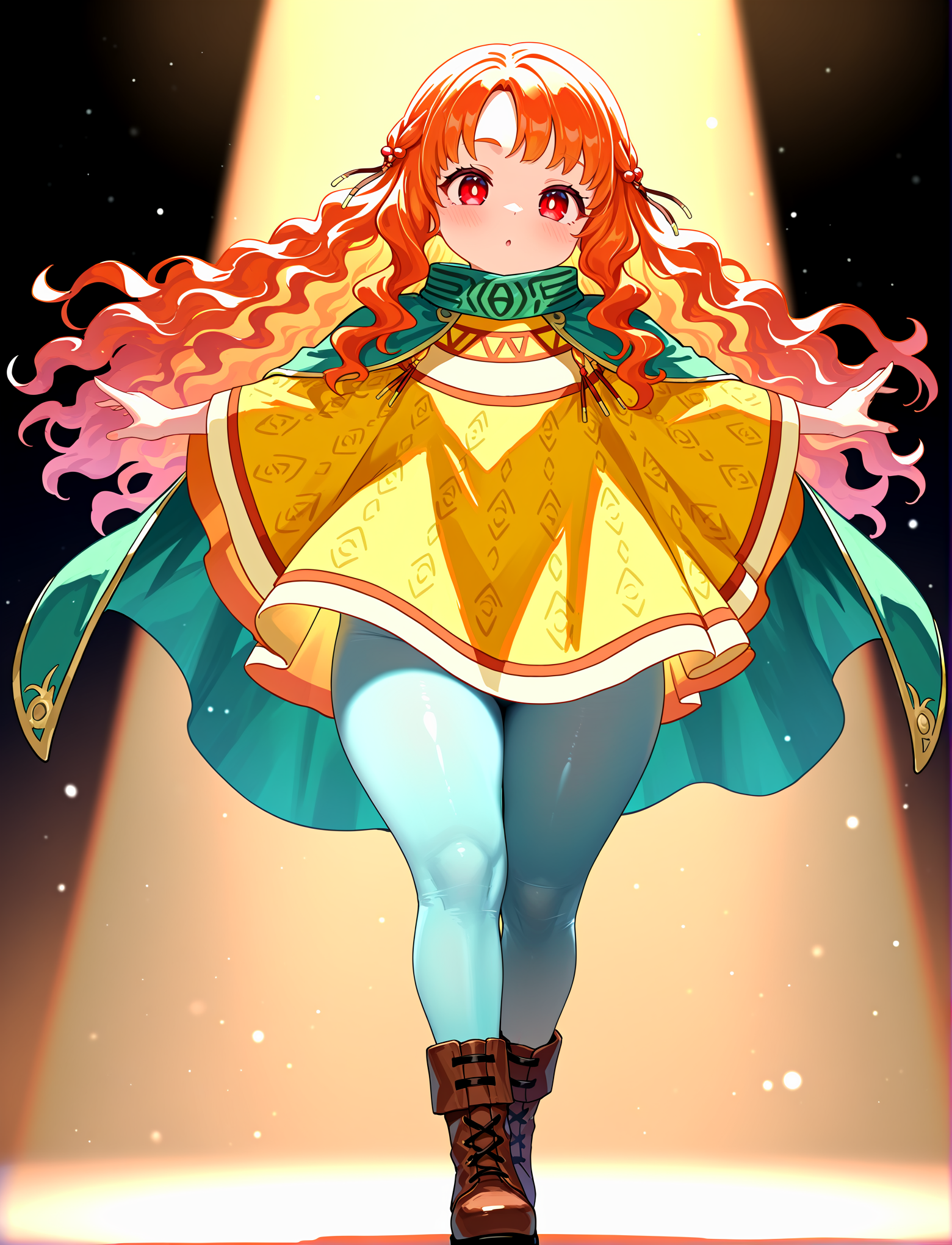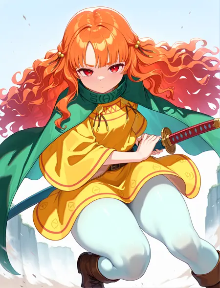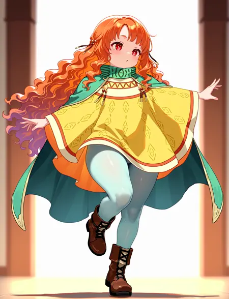 YuneRD, long hair, wavy hair, orange hair, red eyes, yellow poncho, light-blue pantyhose, brown boots, green cape,