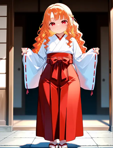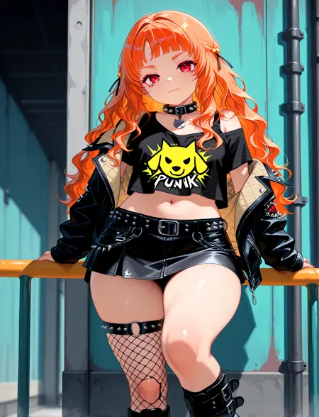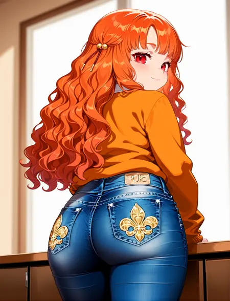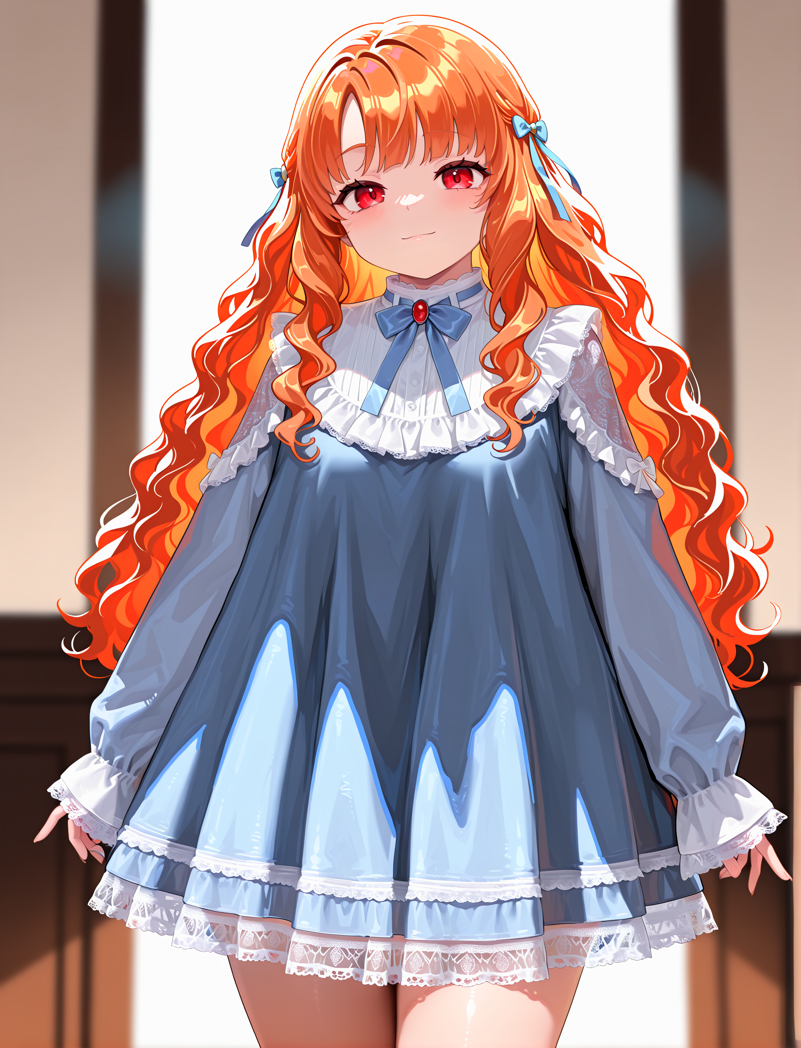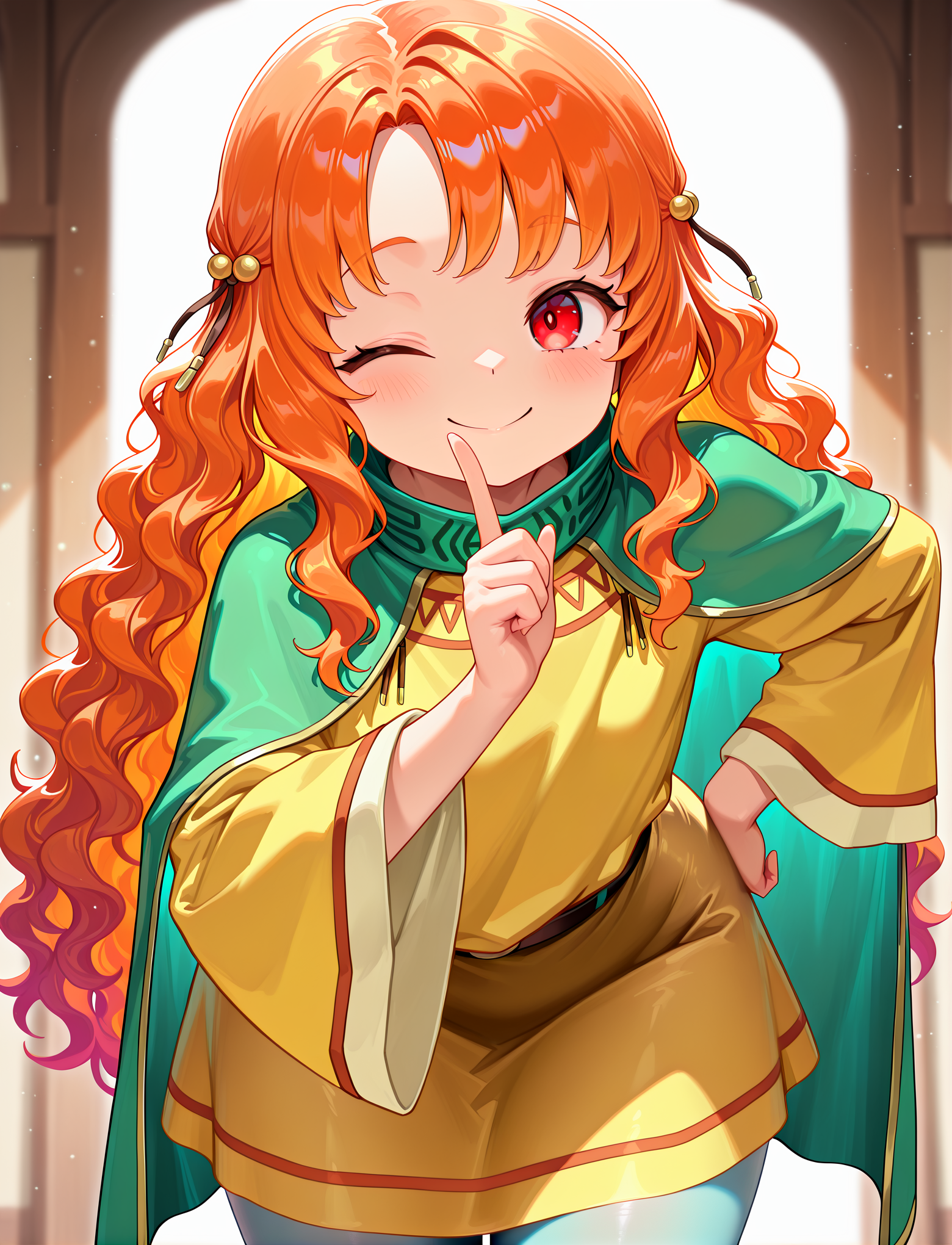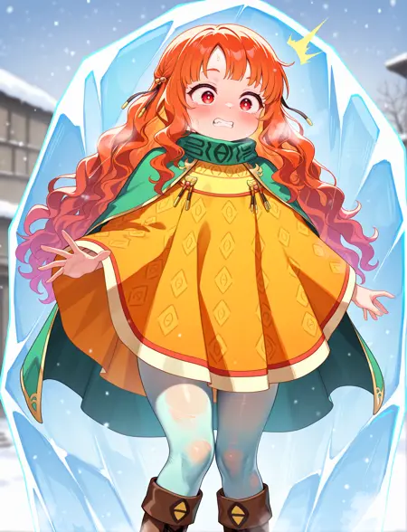 YuneRD, long hair, wavy hair, orange hair, red eyes, yellow poncho, light-blue pantyhose, brown boots, green cape,