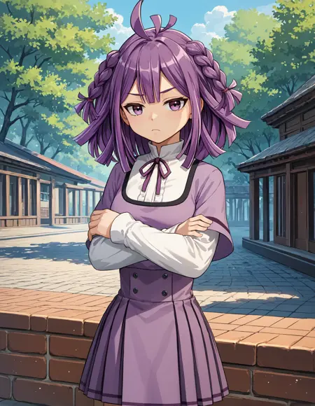 外观: 紫色头发,齐平发尾,侧边辫子,呆毛,紫色眼睛