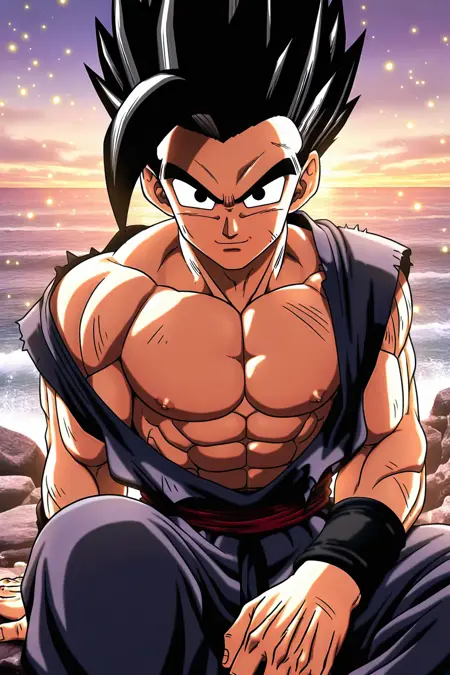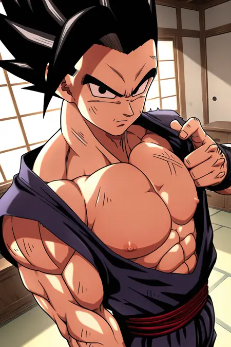 gohansuper, spiked hair, dougi, wristband, red sash, boots, muscles