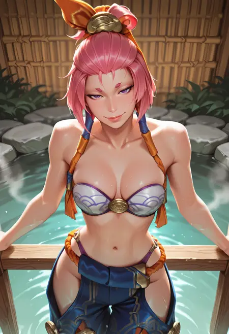 sbsyunarail, 短发, 发饰, 裸露肩膀, 粉色头发, 露脐, (发管:1.2), 嘴唇, 发髻, 紫色眼睛, 中等胸部, 蓝色裤子, 宽松裤子, 侧腰开口, 紫色内裤带, 发带, 短眉毛, 绳子, 文胸, 无肩带, 木屐,
