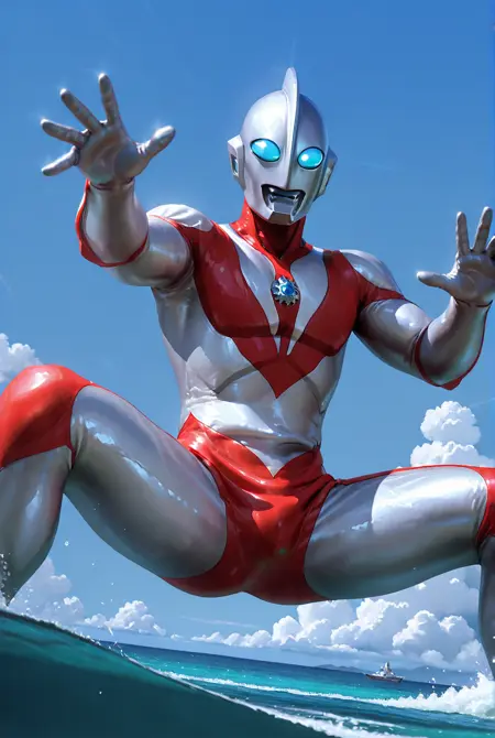 ultraman p0wed, alien,tokusatsu,blue eyes,bodysuit,glowing eyes, boots