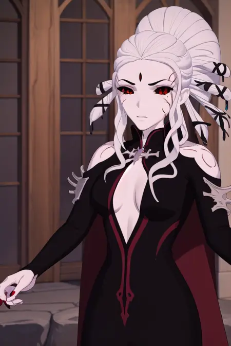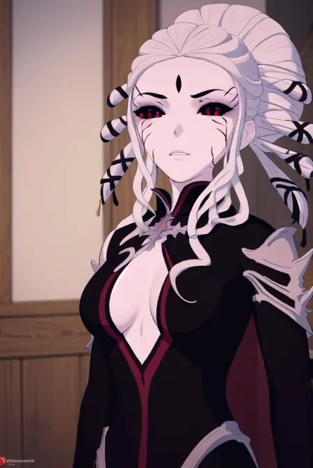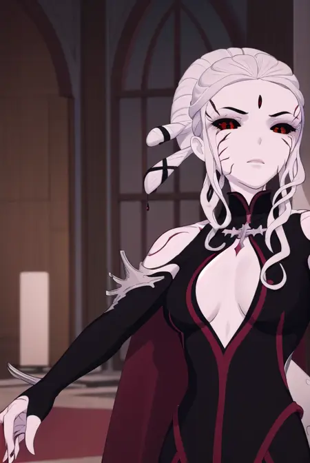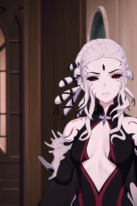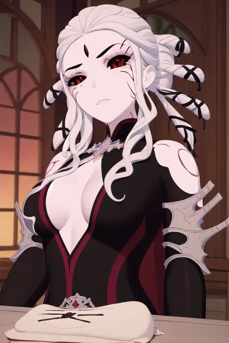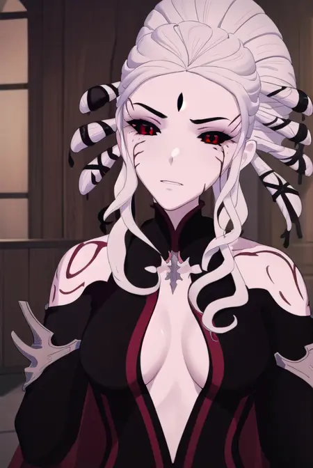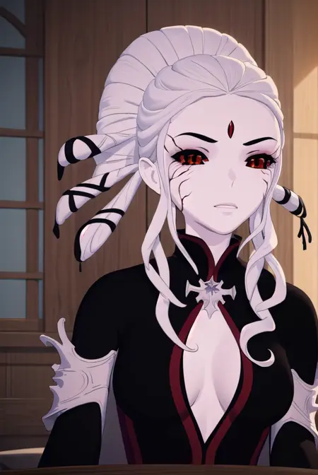 salem, 긴 머리, (빨간 눈:1.2), 흰 머리, 얼굴 문신, 색상이 있는 공막, 이마 문신, (검은 공막:1.5),