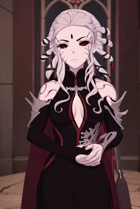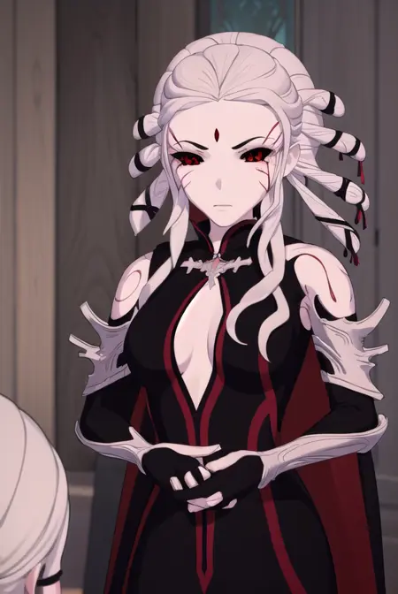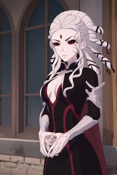 salem, long hair, (red eyes:1.2), white hair, facial mark, colored sclera, forehead mark, (black sclera:1.5),