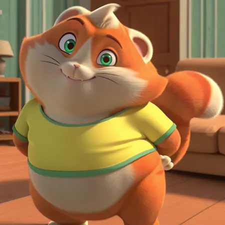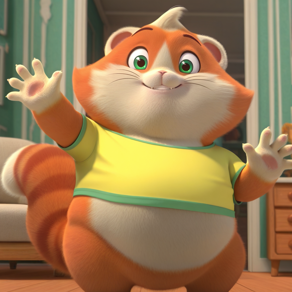male, furry male, anthro, solo, young, cat, orange fur, white fur, two-tone fur, striped fur, hair tuft, green eyes, pink nose, whiskers, fangs, small ears, round ears, nails, pawpads, striped tail, dipstick tail, fat, short
