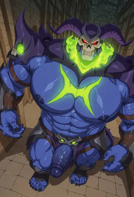 Skelegod, skull face, blue skin, large muscles, glowing red eyes, dark blue nipples, purple dragon horned helmet, black gloves, black armor, glowing green chest symbol, green fire neck, glowing green armor accents, purple cape, visible feet
