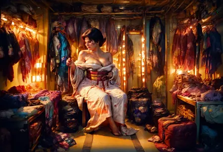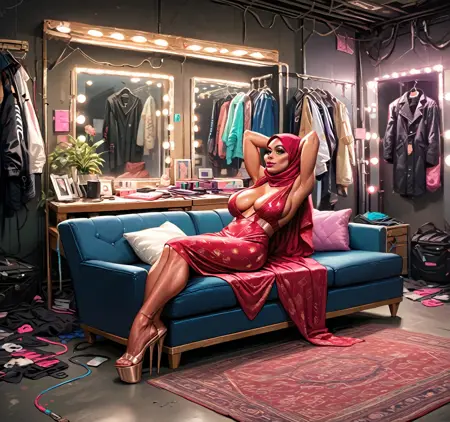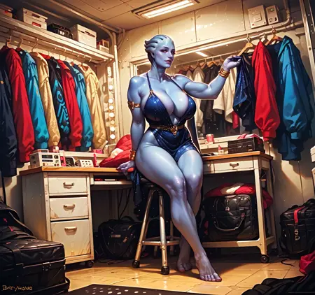 主要なトリガー: dr3ssing。補助的な言葉: backstage, dressing room, backstage dressing room, clothes hangers, mirror, dressing desk, door, clutter, scenery,
