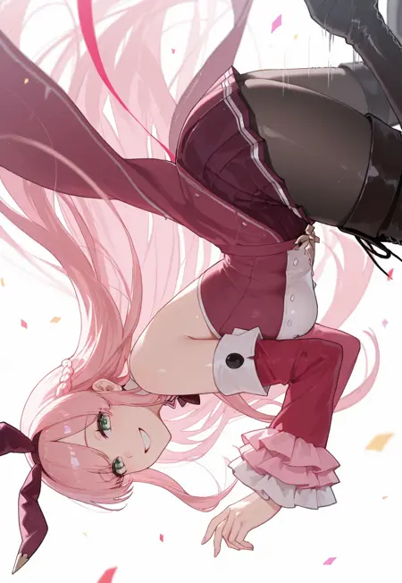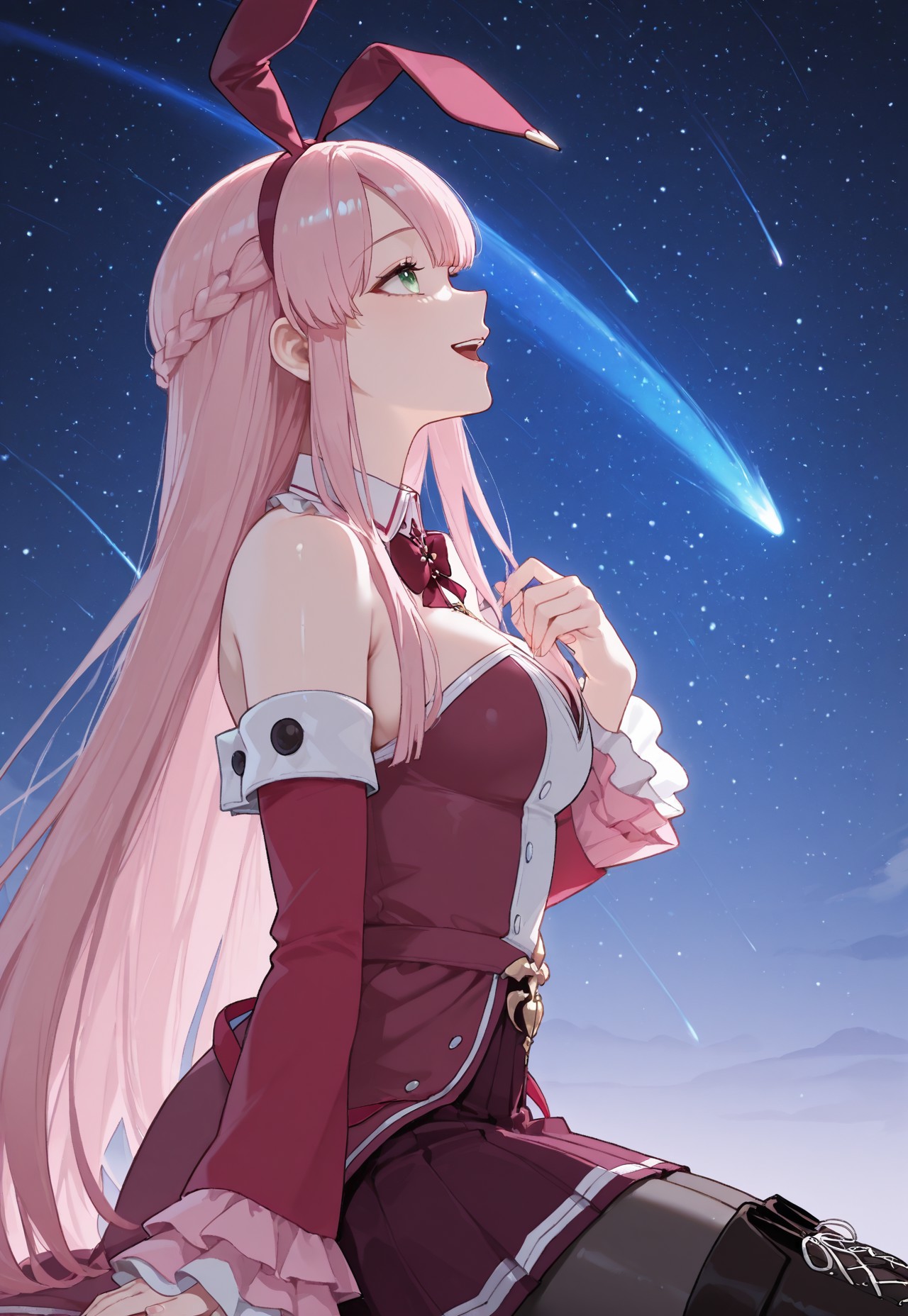 긴 머리, 분홍색 머리, 곧은 머리, 땋은 머리, 앞머리, 뒤로 땋은 머리, 녹색 눈, 가상 동물 귀, 토끼 귀, 헤어밴드, 토끼 귀 헤어밴드, 진홍색 옷, 네크라인, 어깨 노출 네크라인, 하트형 네크라인, 짧은 치마, 주름 치마, 자주색 치마, 허리 아래까지 내려오는 망토, 금색 옷, 금속 액세서리, 어깨 노출, 분리된 소매, 손목을 넘는 소매, 프릴이 달린 소매, 빨간 리본, 리본 타이, 흰색 칼라, 분리된 칼라, 앞치마, 팬티스타킹, 회색 팬티스타킹, 부츠, 허벅지 부츠, 검은 부츠, 하이힐 부츠, 끈 달린 부츠,