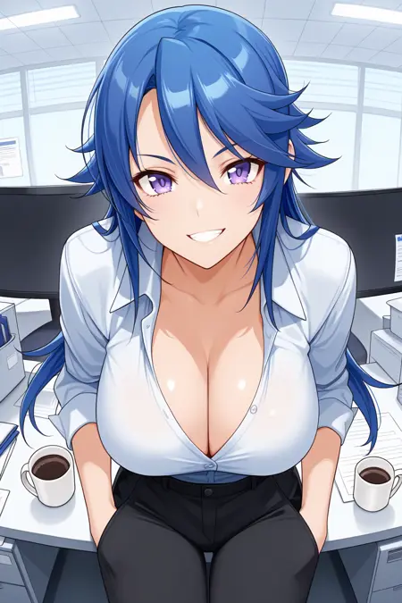 Appearance : s4y0, large breasts, purple eyes, blue hair, spiky hair, hair between eyes, swept bangs, very long hair