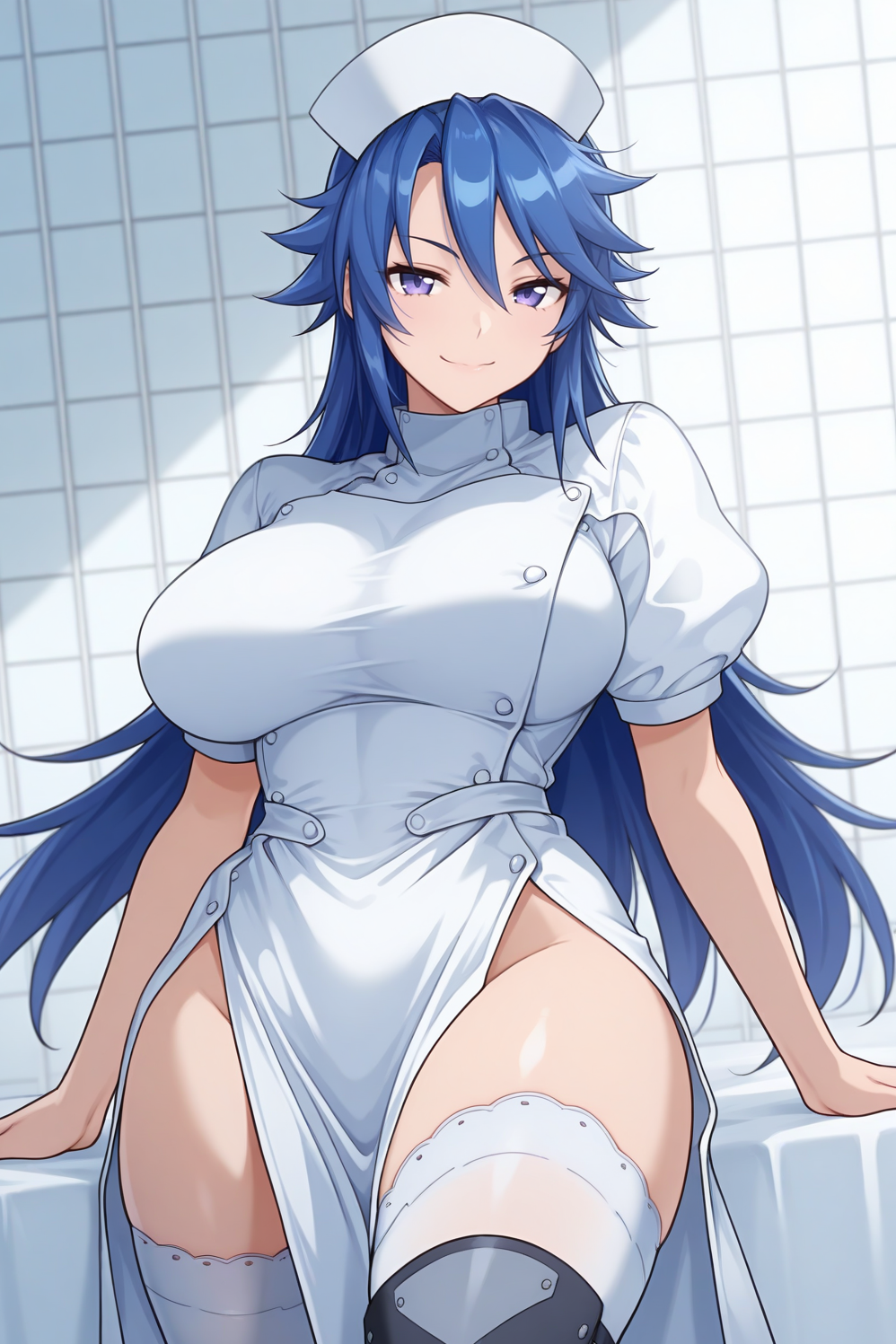 Outfit : nurse cap, white dress, long dress, double-breasted, pelvic curtain, puffy short sleeves, lace-trimmed thighhighs, white thighhighs, thigh boots, two-tone boots, grey boots, black boots