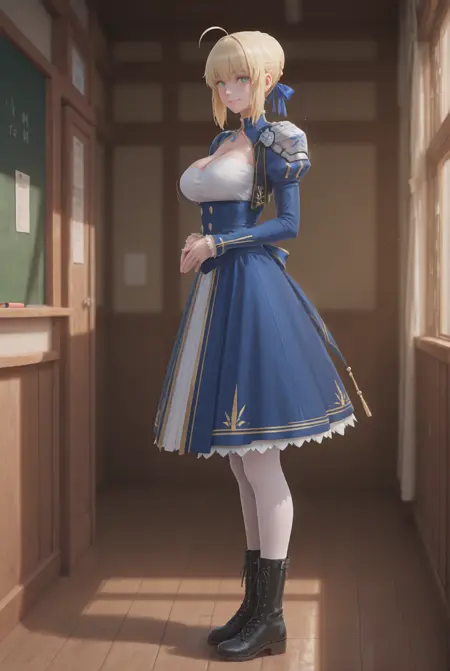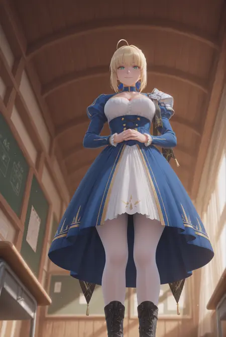 StarRailSaber, 1girl, solo, saber (fate), artoria pendragon (fate), ahoge, blonde hair, dress, long sleeves, boots, straight-on, armor, ribbon, blue dress, juliet sleeves, tachi-e, puffy sleeves, blue ribbon, cross-laced footwear, green eyes, lace-up boots, black footwear, shoulder armor, blue eyes, hair ribbon, pantyhose, breasts, bow, short hair, white pantyhose,