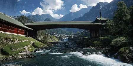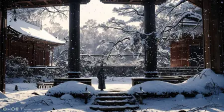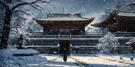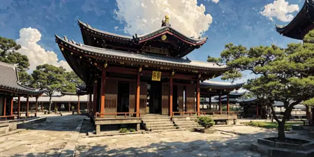 正面提示词建议:DMD, scene, no humans, scenery, east asian architecture, outdoors, architecture, tree, sky, day, cloud, watermark, shrine